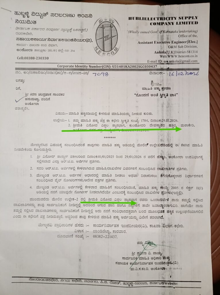 ಕಥೆ ಶುರುವಾಗುವುದು ಹೀಗೆ; ನಾನು ದಿನಾಂಕ 29-01-2026 ರಂದು ಹೆಸ್ಕಾಂ ಉಪವಿಭಾಗಕ್ಕೆ ಒಂದು ಮಾಹಿತಿ ಹಕ್ಕು ಅರ್ಜಿಯನ್ನು ಸಲ್ಲಿಸಿದೆ. ಅದರಲ್ಲಿ ನಾನು ಕೇಳಿದ್ದು ವಕೀಲರಾದ ಶ್ರೀ ವಿನೋದ್ ವಿಠ್ಠಲ ಶಾನ್ಭಾಗ್ ಅವರು ಇಲಾಖೆಗೆ ನೀಡಿದ ದೂರು ಅಥವಾ ಅರ್ಜಿಗಳ ಬಗ್ಗೆ.